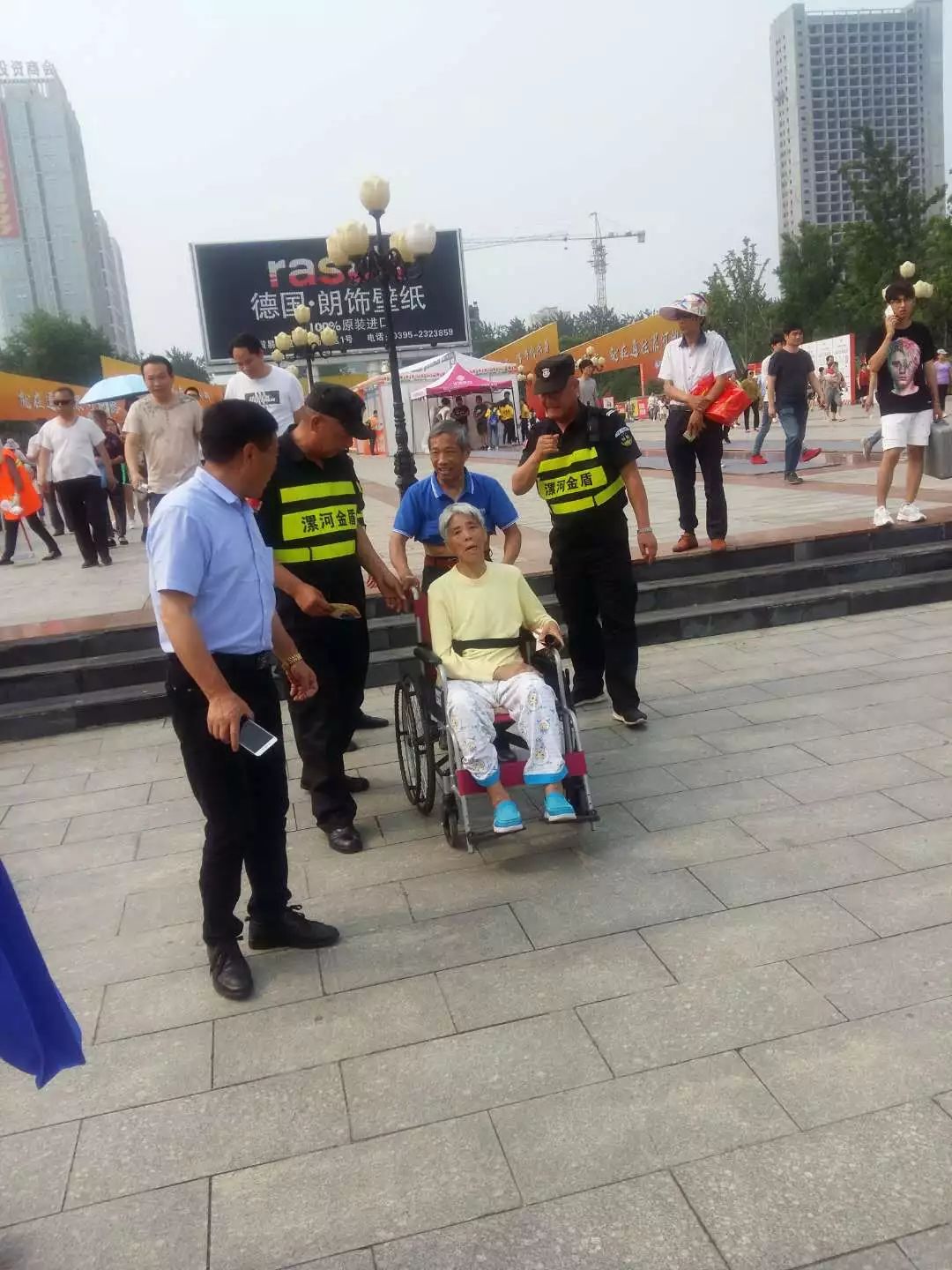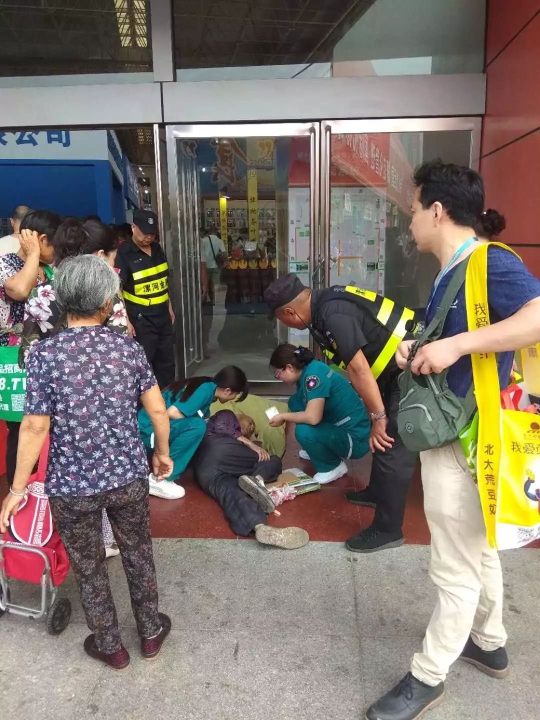 ? ? ? 5月17日上午10:00左右,由于天氣炎熱,一名70歲左右老人暈倒在展館門口,執(zhí)勤保安及時(shí)發(fā)現(xiàn)立馬撥打急救電話,并細(xì)心找來紙箱子為老人墊在身下,直到急救醫(yī)生將老人拉回醫(yī)院救治,才放心繼續(xù)工作!